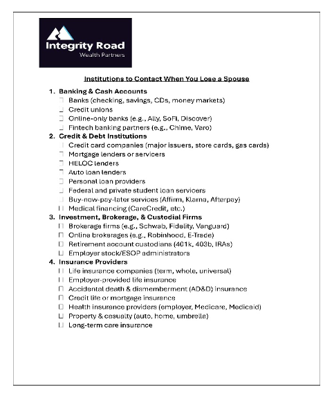 As you work with your attorney and financial advisor, you need to notify all the institutions regarding your late spouse’s passing. After contacting them, each institution will share their process for closing their account / file and transferring the account into your name or to the pertinent beneficiary. Moreover, disbursing funds to the appropriate entity may be necessary, too. Please note, most institutions require a death certificate. Typically, it takes 2-4 weeks for you to receive the official death certificate for your spouse, and a best practice is to request 10-15 copies of the certificate. You will find some institutions require an original death certificate. When you possess multiple certificates, you will save yourself the headache of needing to request more from the state. To ensure you contact all the applicable institutions, click the image below for a comprehensive checklist of the institutions to contact after the loss of a spouse. Ideally, your financial advisor should assist you with the process.